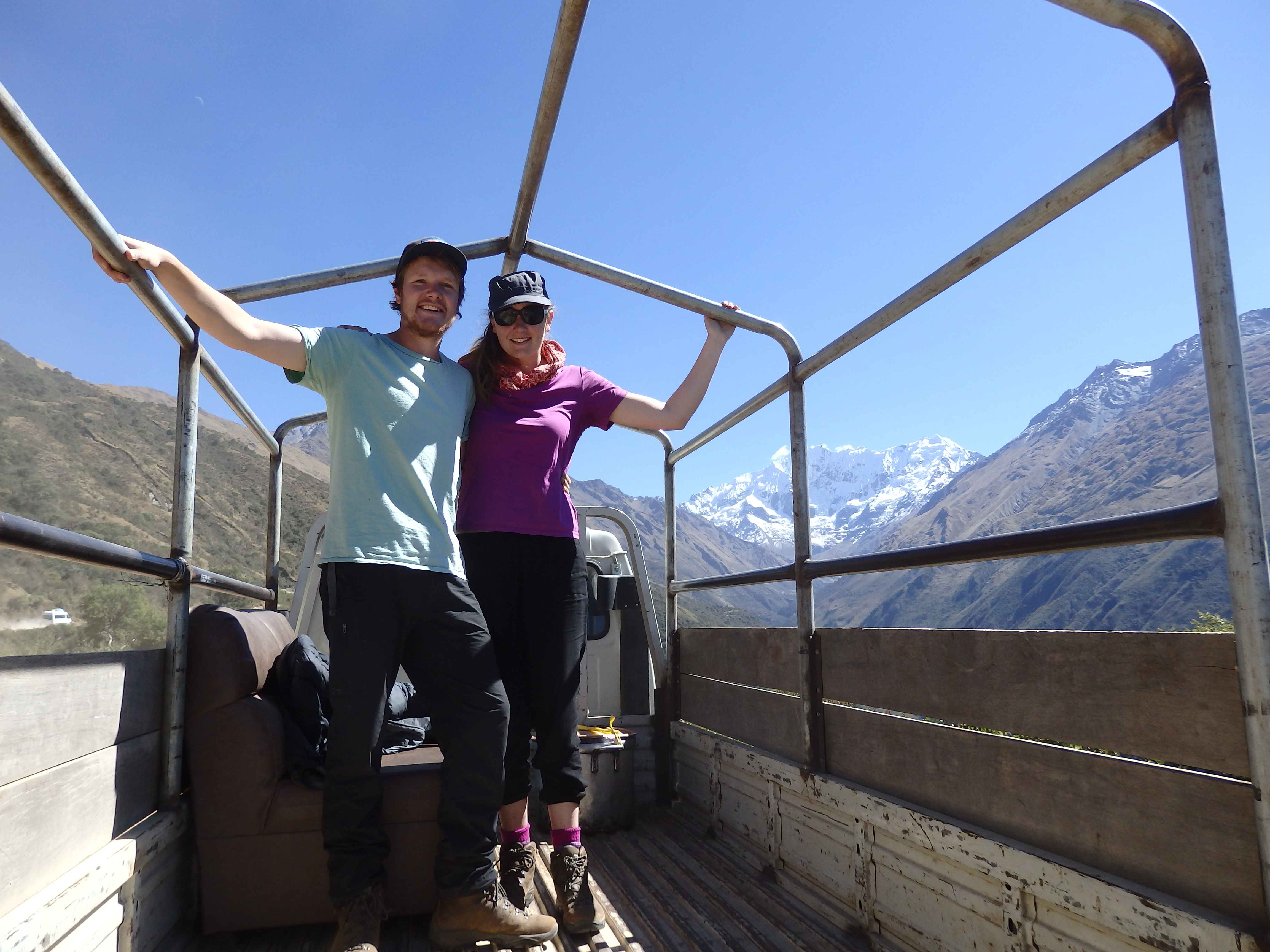 We headed off from Cusco at 6.30 on the first morning. When we arrived in the village of Mollepata an hour or so later we piled out of the crowded collectivo (a shared van). As one woman climbed out of the van there was a loud squarking coming from her bag. It turns out a chicken had hitched a ride in the van as well, and neither Samara nor I had noticed its presence during the trip. In Mollepata we met Edwin and Flor, who manage the company Refugios Salkantay. After a tasty breakfast cooked by the mother of the family we jumped into the back of Edwin’s truck, which he had thoughtfully fitted out with a comfortable couch for our ride up into the hills. As we wound our way up the valley towards Soraypampa, it felt great to have the wind in our hair. As we came around the corner we got a tasty view of the mountains that lay ahead.