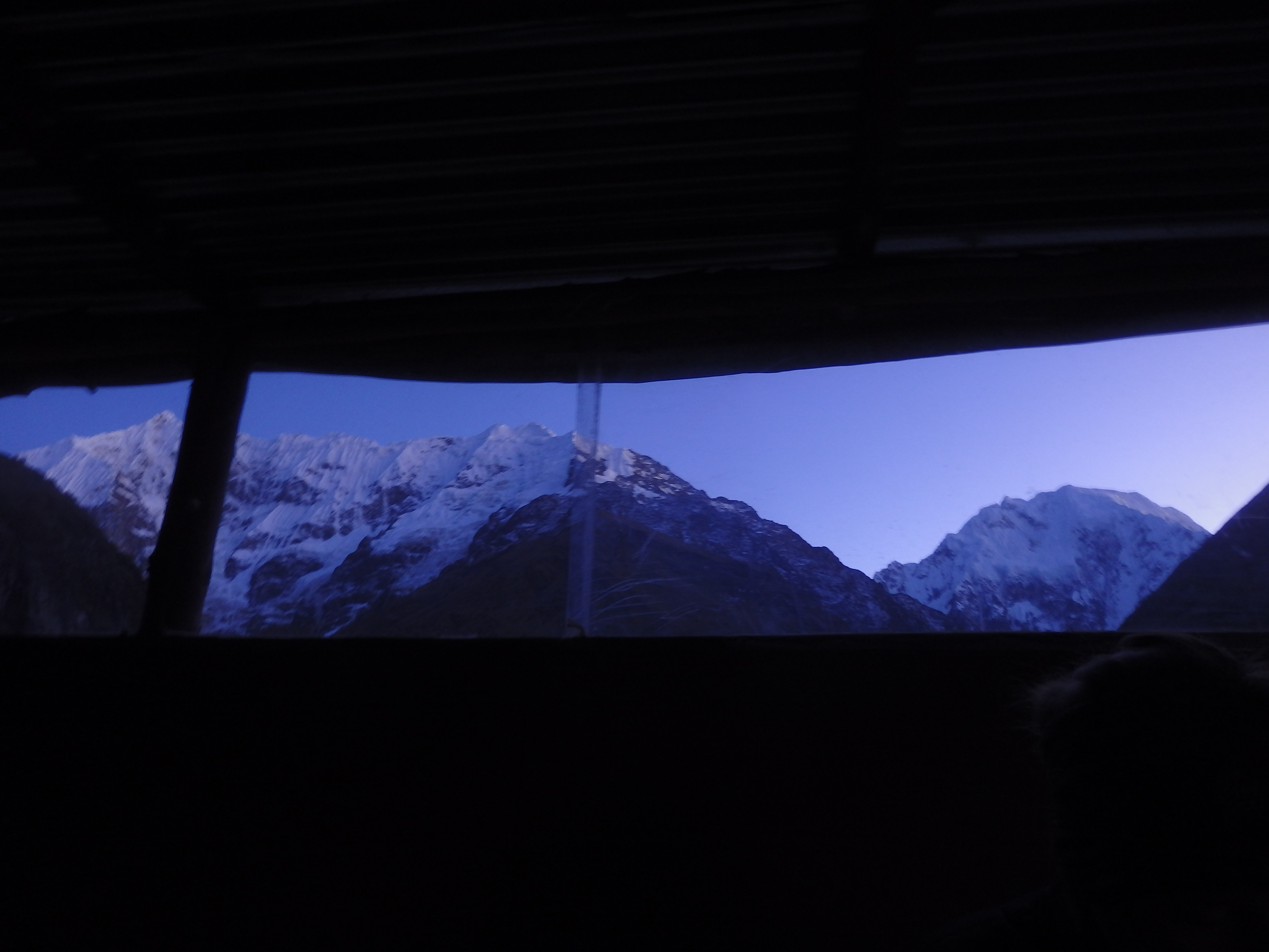 Our bed for the night was covered in a shiny gold sheet – quite a contrast to the blue tarpaulins that were pinned against the walls and the compressed mud floor. However, after the day of walking over the pass and a good feed, I didn’t find it hard to fall asleep.