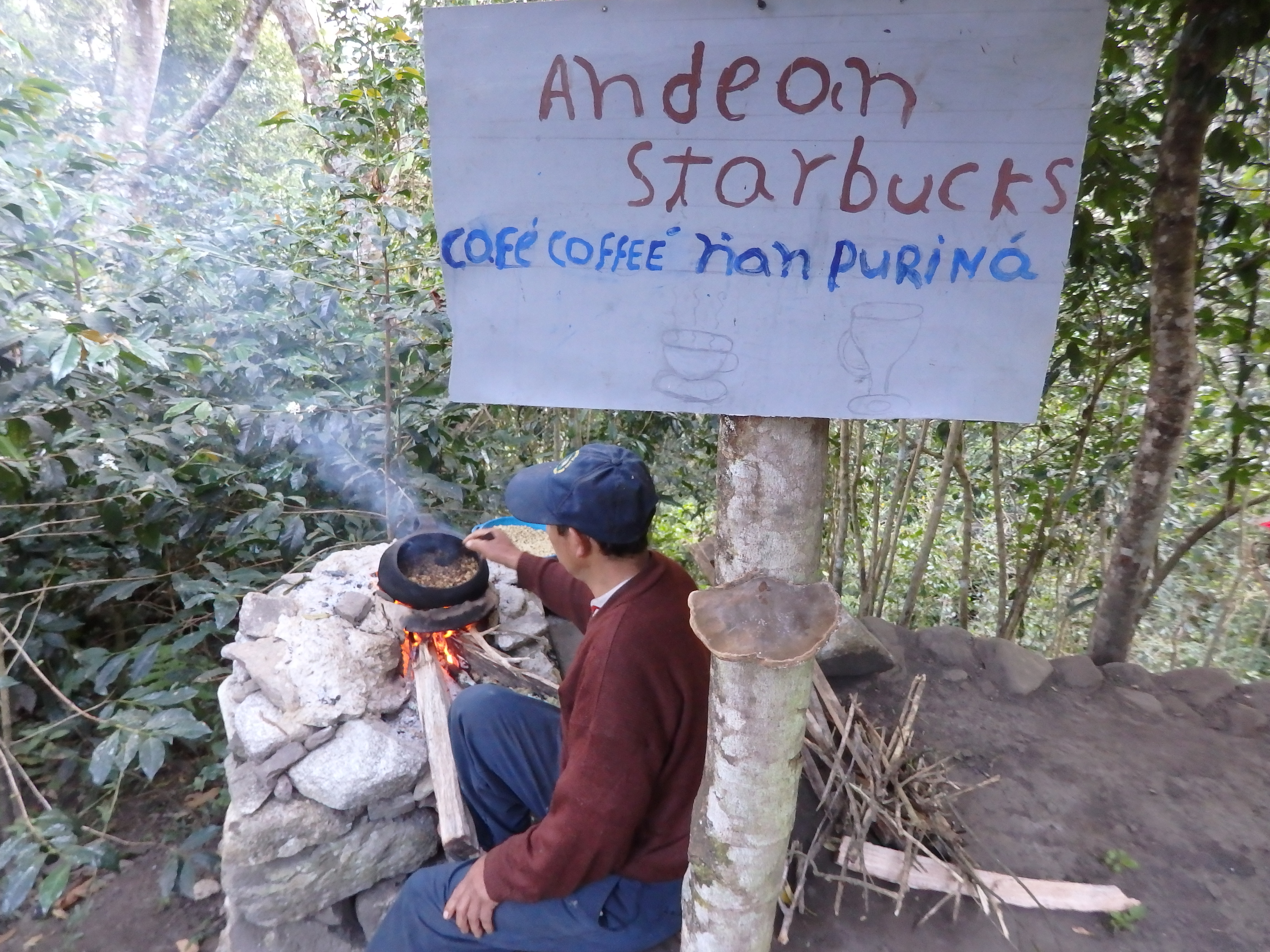 We had heard about a side-trip that goes past the ruins of Llactapata which we were keen to do. So after a 5 am alarm and a quick breakfast we caught a taxi to the trailhead. The trail headed up the hill for 3 hours passing plantations of banana and coffee. A man sat by the path roasting coffee beans over a small fire. A sign read “Andean Starbucks”. Further up the hill someone had set up a small stall selling Coca-Cola and chips to the passing trekkers. The stall appeared to be unmanned except for a dog that was casually hanging out on its roof. We bought an enormous avocado (from the owner that later turned up, not the dog) which we enjoyed spread on some gluten-free rice crackers that I had found in a small supermarket in Cusco.