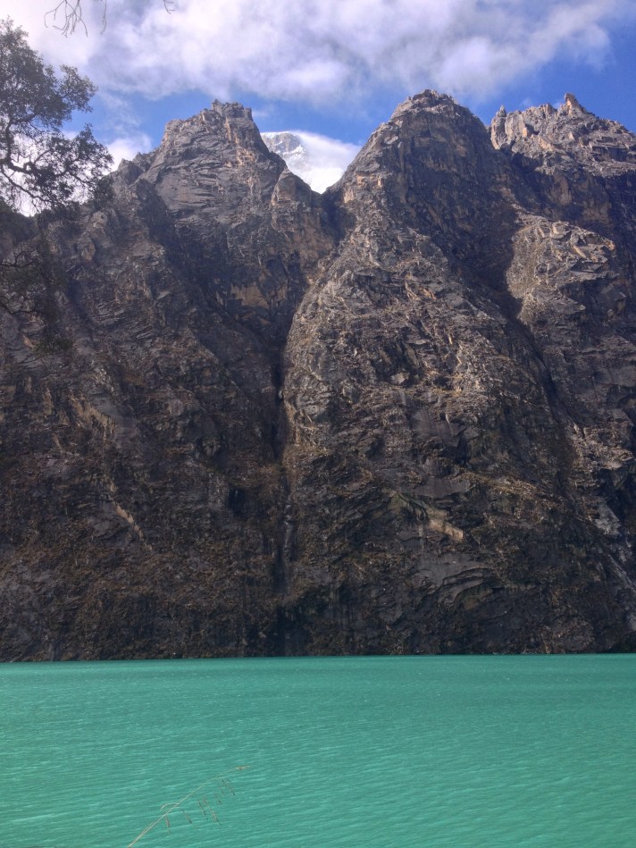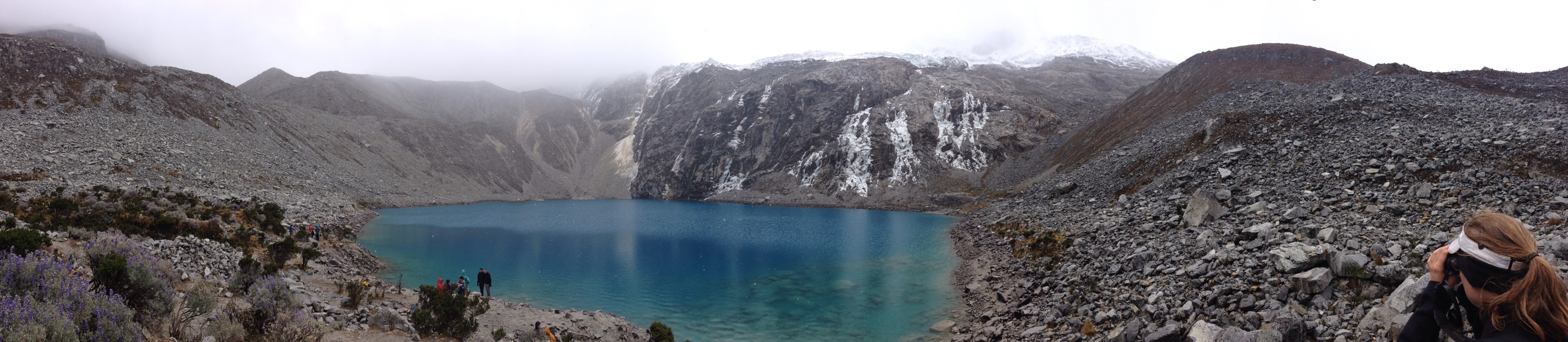 We reached Laguna 69 after 2.5 hours of walking, just as the rain turned to snow. The lake was the usual beautiful turquoise blue typical of glacial lakes. We huddled behind some bushes to eat our lunch out of the slushy snow. A brave Israeli attempted to go for a swim but only lasted a few fractions of a second before he jumped back out of the water screaming loudly. There were some impressive rock cliffs on the other side of the lake, but the clouds prevented us seeing what lay beyond them. However, the occasional roar of ice breaking off a glacier coming from high above suggested that the mountain continued a fair way higher than these cliffs. Indeed, we had seen many photos of this place already that showed the snowy peak of the Chacraraju mountain (6001m) rising high above the lake.