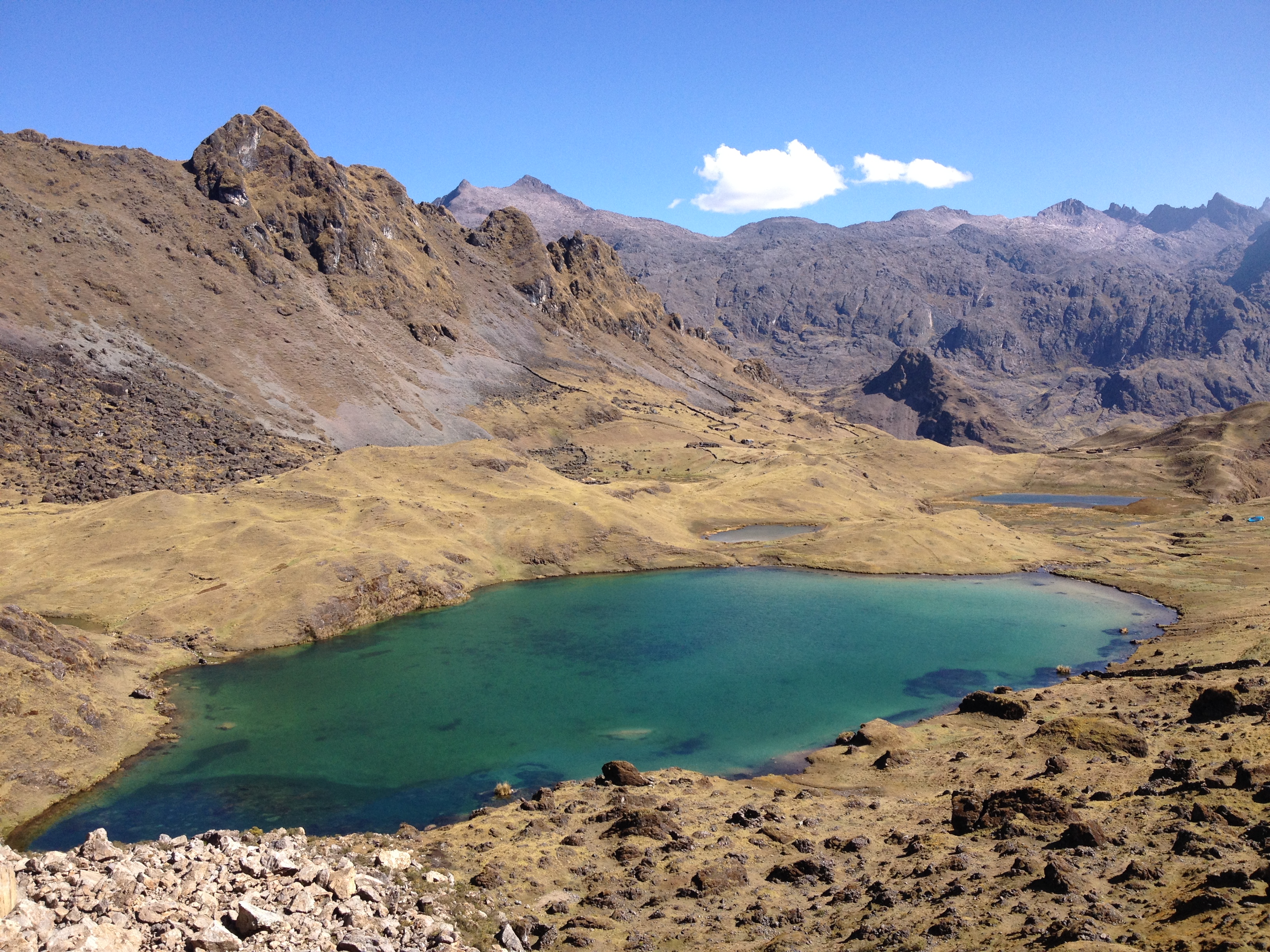We passed a series of nice waterfalls and then after the town of Quishuarani we headed up a steep, but beautiful, valley past grazing alpacas. We had lunch at the small lake at the head of the valley before making the final climb to the pass. From here, there were amazing views back across towards Sawasiray mountain and down into the next valley, where several bright blue glacial lakes sat.