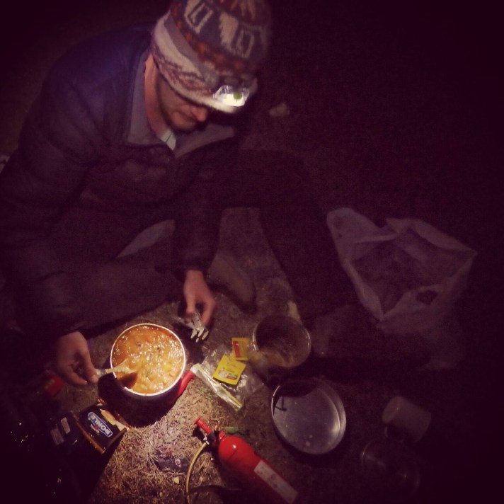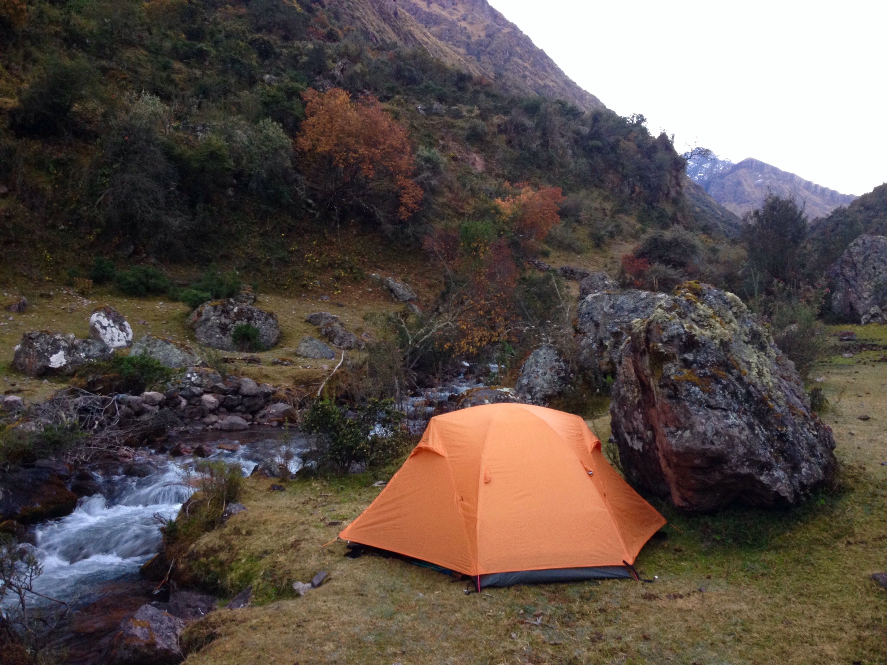 I had been told there wouldn’t be much water on the trail, so I was carrying 5 litres which was feeling rather heavy on my back. I decided that was silly, since there was a very clean looking river flowing all the way down the valley, so I tipped most of it out. That night we set up camp on a flat bit of grass by the river, hidden from the track behind a large rock.