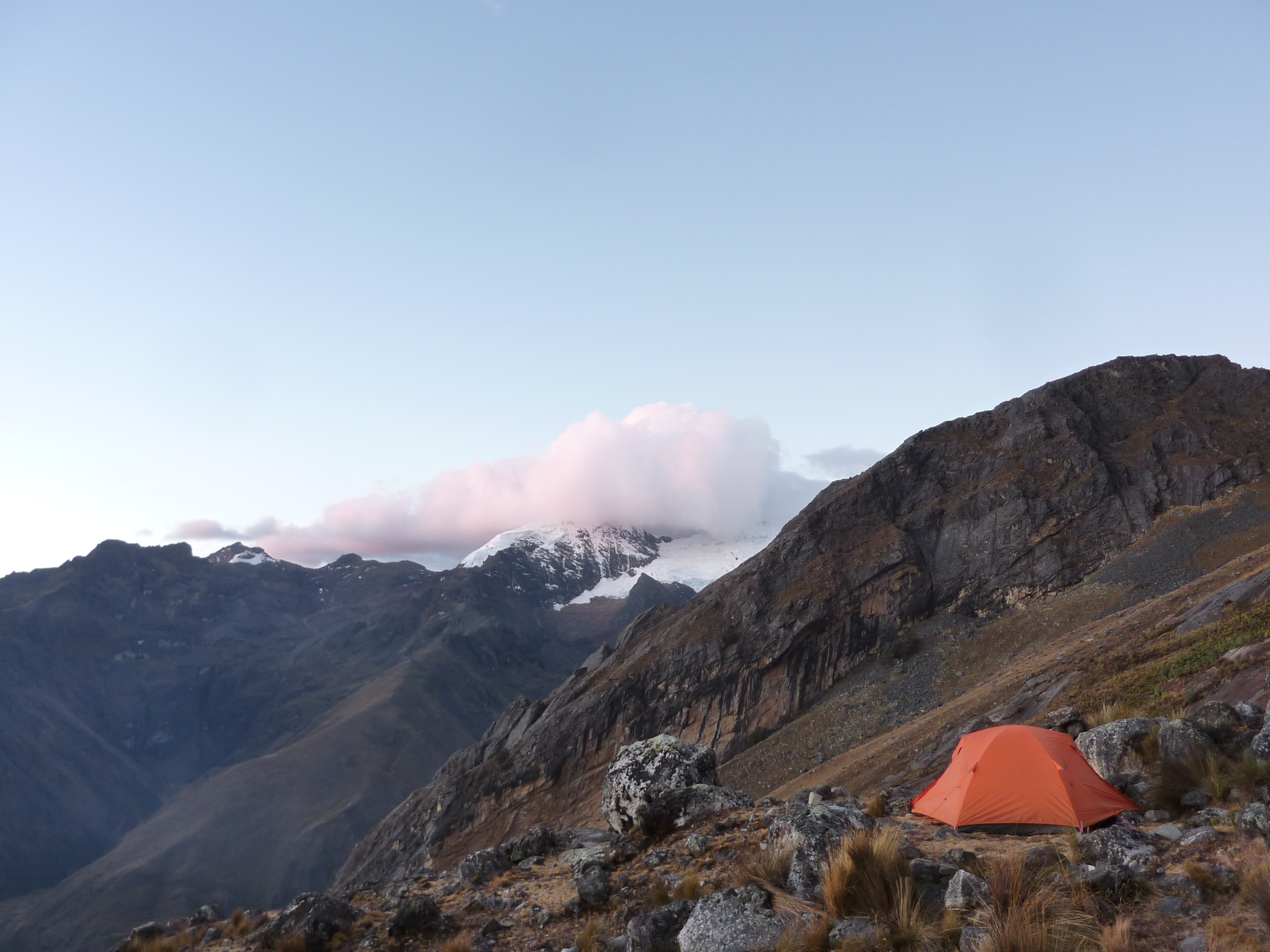 The fire was still going when we woke up the next morning. The smoke gave a nice colour to the sky, and the mountains at the head of the valley looked amazing. We headed steeply up the Yanajanca valley. Just after a large clearning, our guide took us slightly off track and up the wrong valley. She hadn´t done the walk in over four years, so she was forgiven but seemed quite stressed out about the situation. A short side trip gave us a good view over Laguna Sactaycocha. From here, it was another steep climb up to Paso Yanajanca (4610m). On the way up we were passed by a group of locals riding up the slopes on some very nice looking horses. The pass was rather windy, but offered some magical views. We headed down through Huillca and then up the Tayapampa valley towards our camp. From here we got a pretty good view up to Alpamayo whenever the clouds were kind enough to part. A couple of us walked 30 minutes up towards Laguna Safruna Baja, where we got an amazing view up to the snowy peaks of the Pucajirca mountain range.