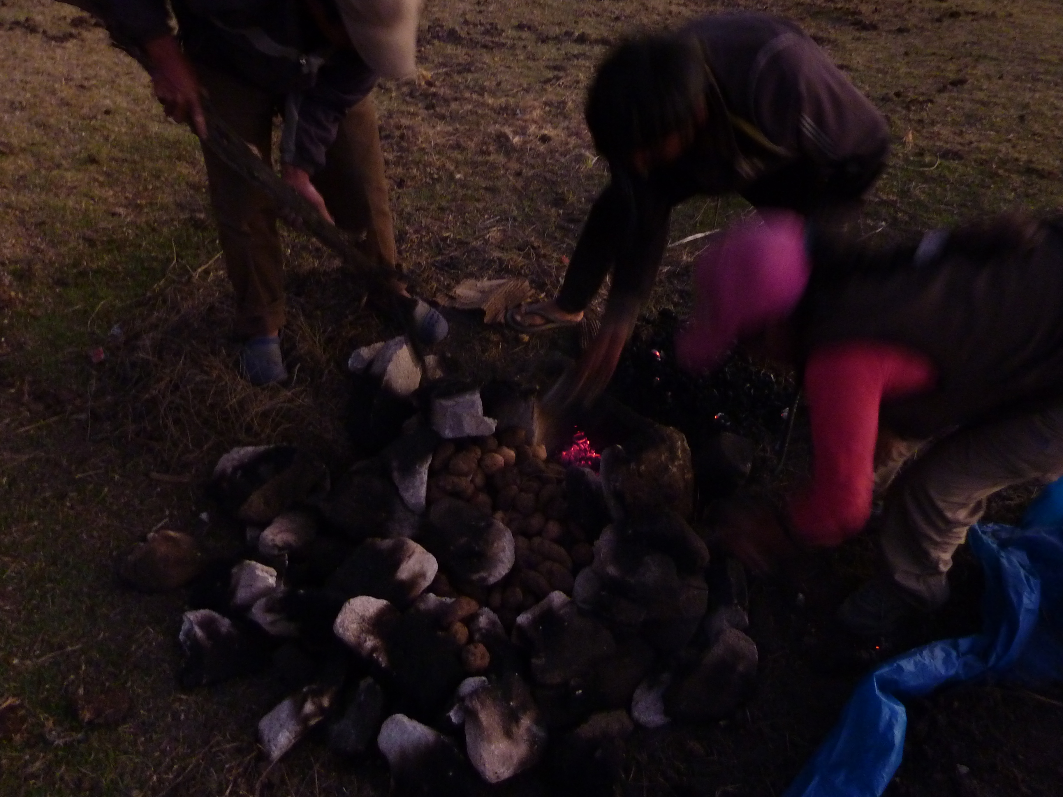 By the time we arrived at our camp at Calamina, the arrieros had started preparing the oven for the Pachamanca. They had obviously done this many times before, as the oven looked like a piece of art. They constructed a very neat looking oven, and soon had a small fire roaring inside it. Margerita took one of the horses down to town to find some supplies for the Pachamanca. Unfortanely she couldnt find any beers or any foil to wrap the meat up with. Once the fire had heated up the rocks enough, we watched on as the top rocks were removed, and the hole in the middle filled with several kilos of potatoes. These were quickly covered with the hot rocks. The meat (marinated and wrapped in some cardboard) was placed on top of these hot rocks and gave off of a delightful smell as they started to sizzle. Over the meat, a thick layer of grass was placed and a few beans. A sheet of plastic was thrown over this, and then covered in a thick layer of soil to keep all the heat inside. For anyone passing by, it would have just looked like a pile of dirt, but we knew it was hiding something much more tasty. Now, we just had to wait 45 minutes for the Pachamanca oven to do its thing.